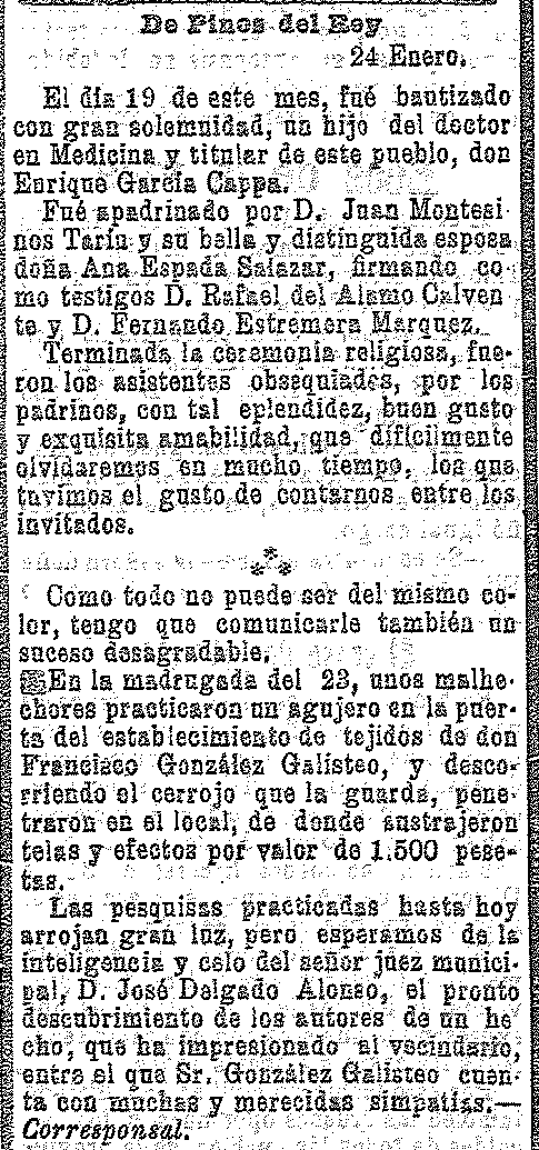 28 de enero de 1910. Bautizado el hijo del médico de Pinos
