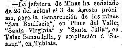 21 de julio de 1910. Minas en Pinos del Valle y Tablate