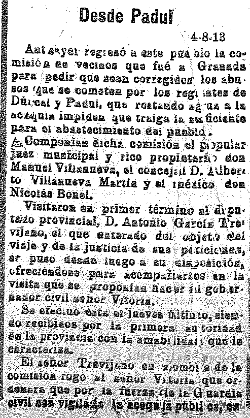 9 de agosto de 1913. Desde El Padul se quejan que los