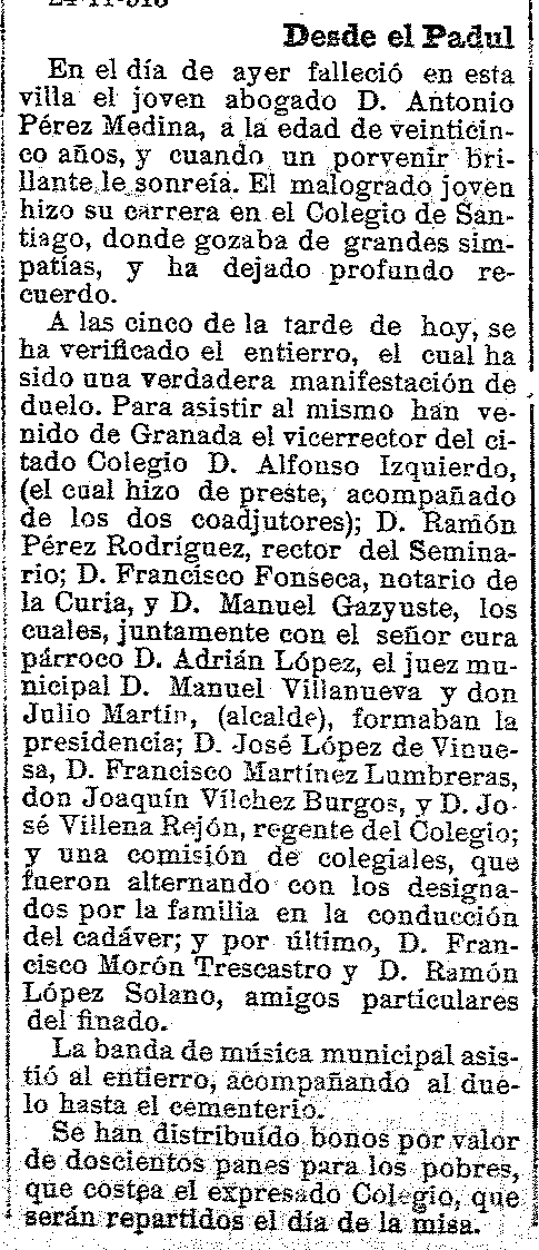 29 de noviembre de 1913. Fallece el joven abogado D. Antonio