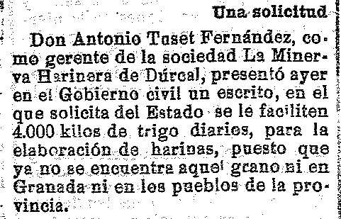 Antonio Tuset de Dúrcal pide al estado se le suministren 4.000 kilos de trigo