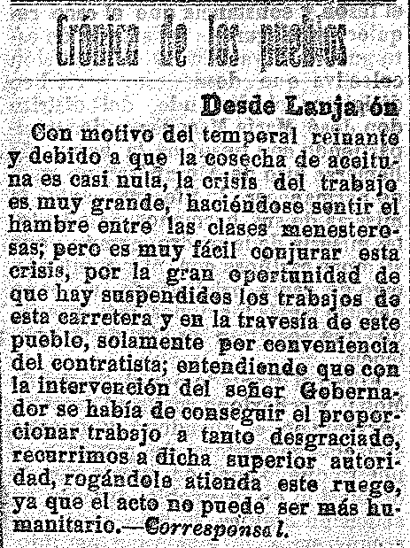 11 de febrero de 1915. Crisis obrera en Lanjarón. Se pide