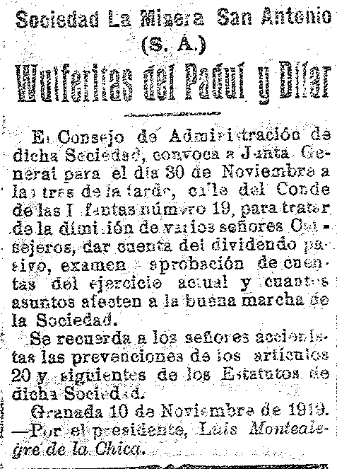 11 de noviembre de 1919. Minas Wulferitas de Padul y Dílar