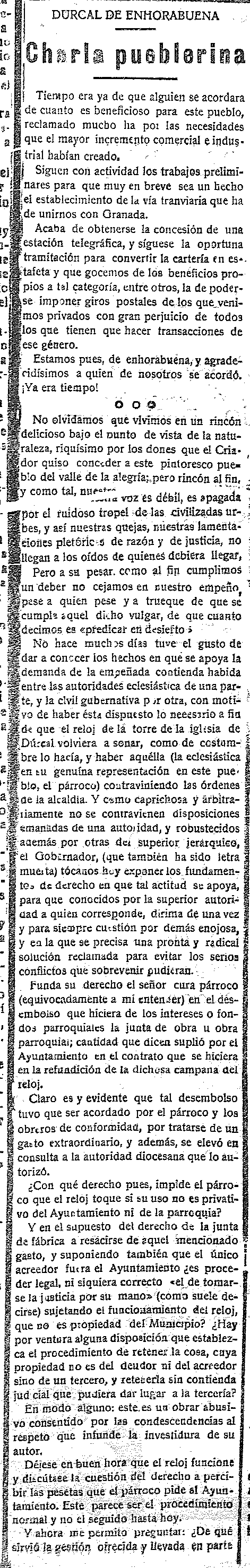 Dúrcal, Se ha concedido una estación telegráfica para Dúrcal y la cartería se va