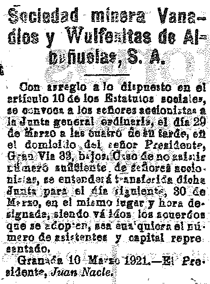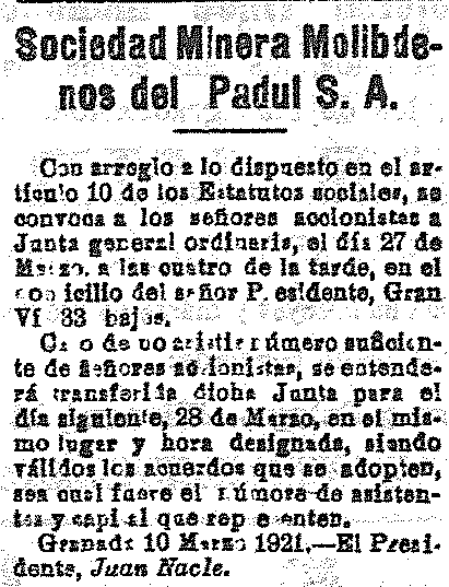 10 de marzo de 1921. Sociedad Minera Molibdenos del Padul S.A