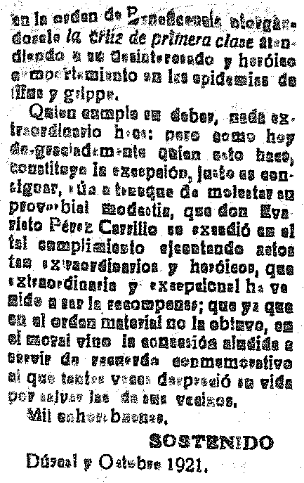 Pérez ha sido recompensado por su actitud en las epidemias de tifus y gripe
