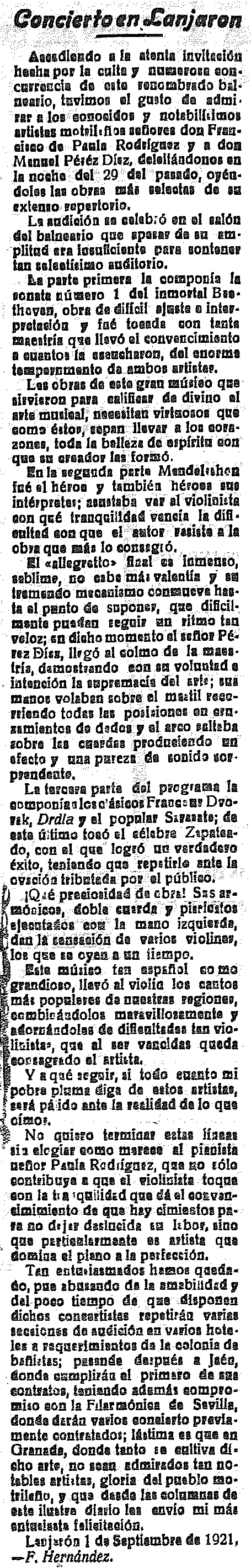 3 de septiembre de 1921. Concierto en el Balneario de