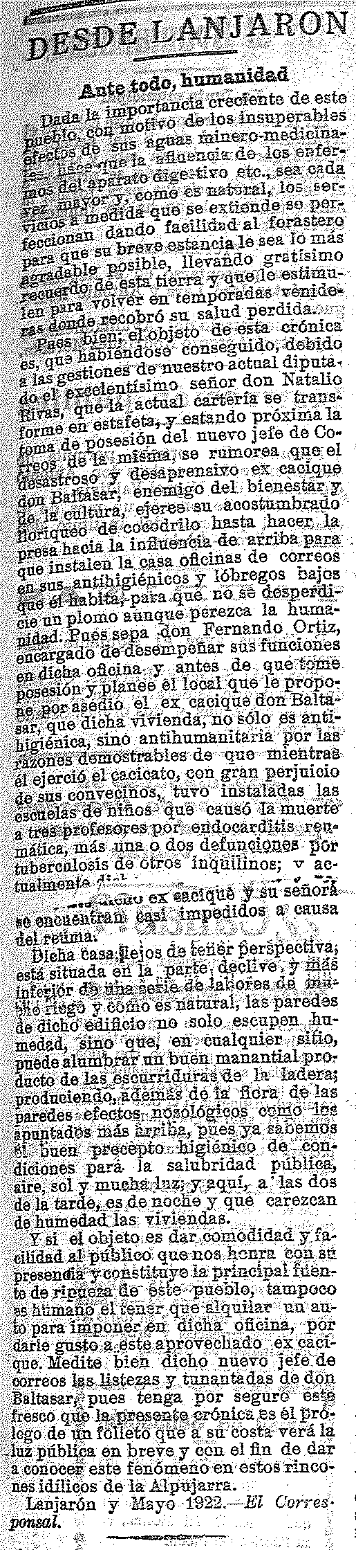 6 de mayo de 1922. En Lanjarón la cartería se transforma en
