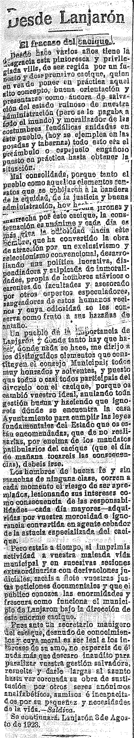 10 de agosto de 1923. Desde Lanjarón. El fracaso del cacique