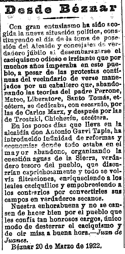 22 de marzo de 1923. Cambio de alcalde en Béznar, se acusa al
