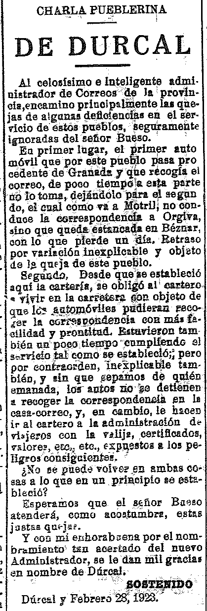 8 de marzo de 1923. Quejas sobre la recogida de correos en