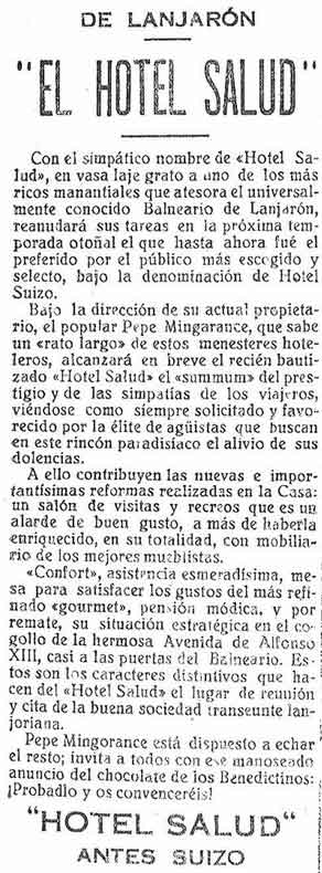1 de septiembre de 1925. Anuncio del Hotel Salud (Antes