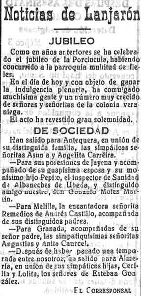 4 de agosto de 1928. Noticias de Lanjarón: Jubileo.