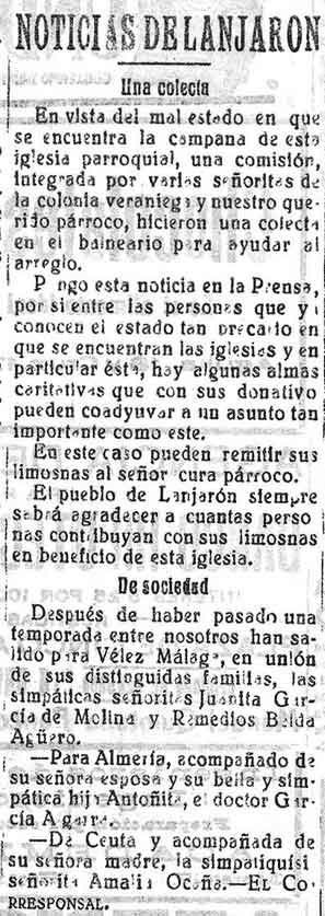 8 de agosto de 1928. Noticias de Lanjarón: Colecta para