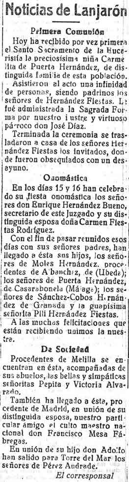 17 de julio de 1928. Noticias de Lanjarón: Primera comunión y