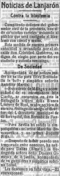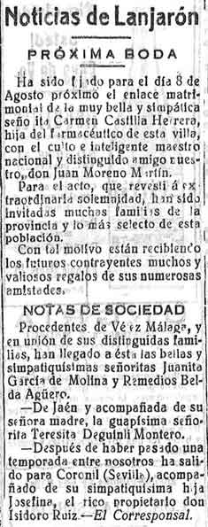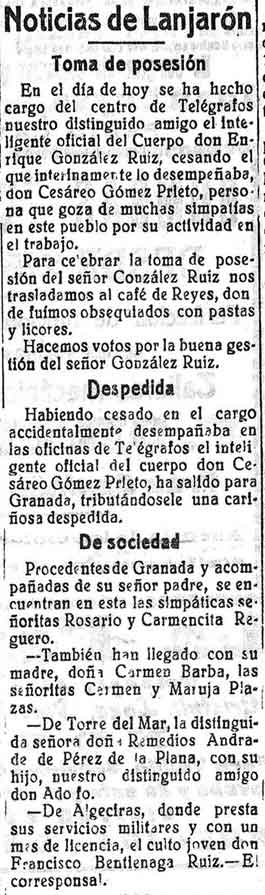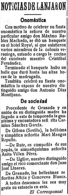 29 de julio de 1928. Noticias de Lanjarón: Onomástica en
