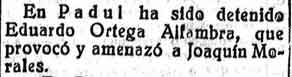 29 de mayo de 1929. Detención en Padul por amenazas