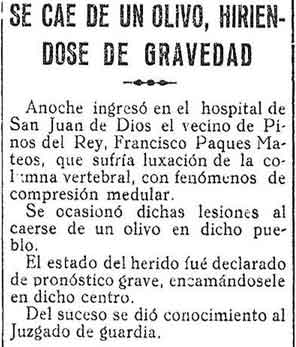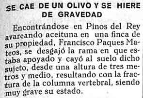 15 de febrero de 1930. Se cae de un olivo en Pinos del Rey