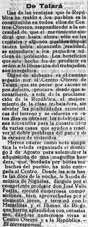 5 de agosto de 1931. Éxito en el Centro Obrero de Talará.