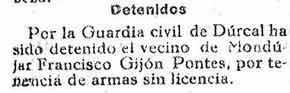 17 de febrero de 1931. Detención en Mondújar por llevar armas