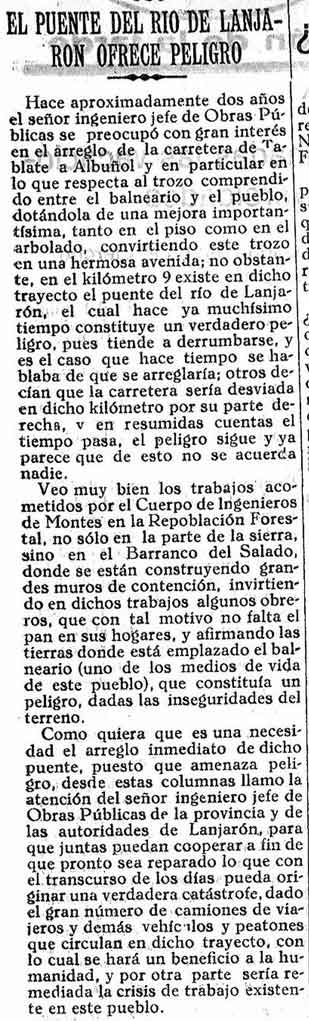 25 de febrero de 1931. El puente del Río de Lanjarón ofrece