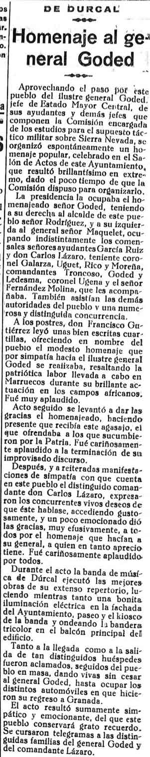 Homenaje en Dúrcal al general Goded y al Comandante Don Carlos Lázaro, jefe del