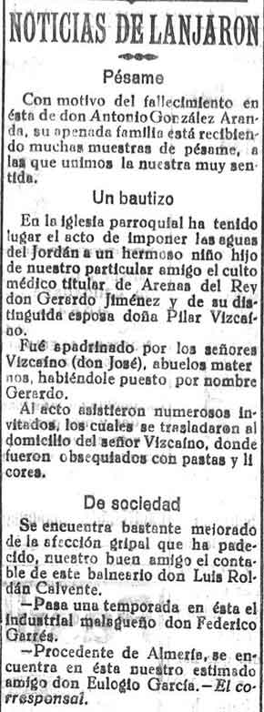 12 de febrero de 1933. Noticias de Lanjarón: Pésame. Un