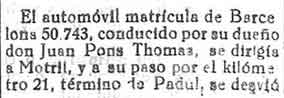 3 de febrero de 1933. Accidente de coche en el Padul al