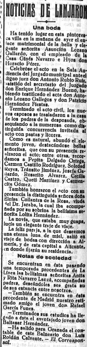 1 de julio de 1933. Noticias de Lanjarón: Una boda. Notas de