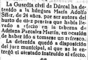 27 de julio de 1933. Detenida e Dúrcal por robar dinero en
