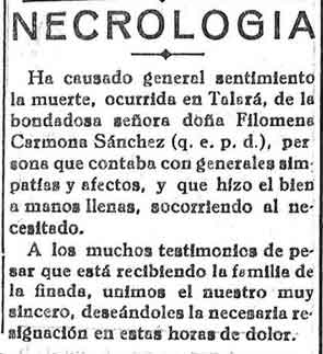 3 de junio de 1933. Muere Filomena Carmona Sánchez en Talará