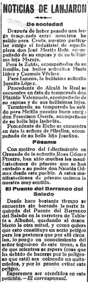 24 de octubre de 1933. Noticias de Lanjarón: De sociedad.