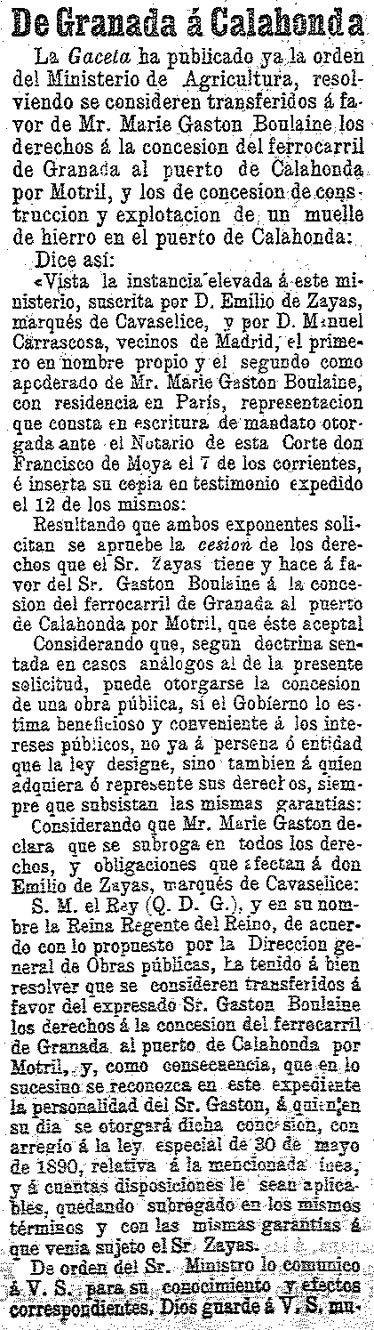 10 y 11 de octubre de 1900. Proyecto de tren Granada-Calahonda para bajar mineral de la Alpujarra
