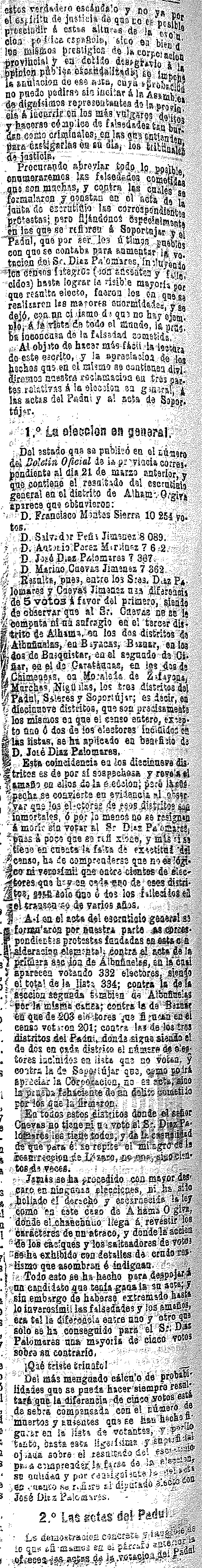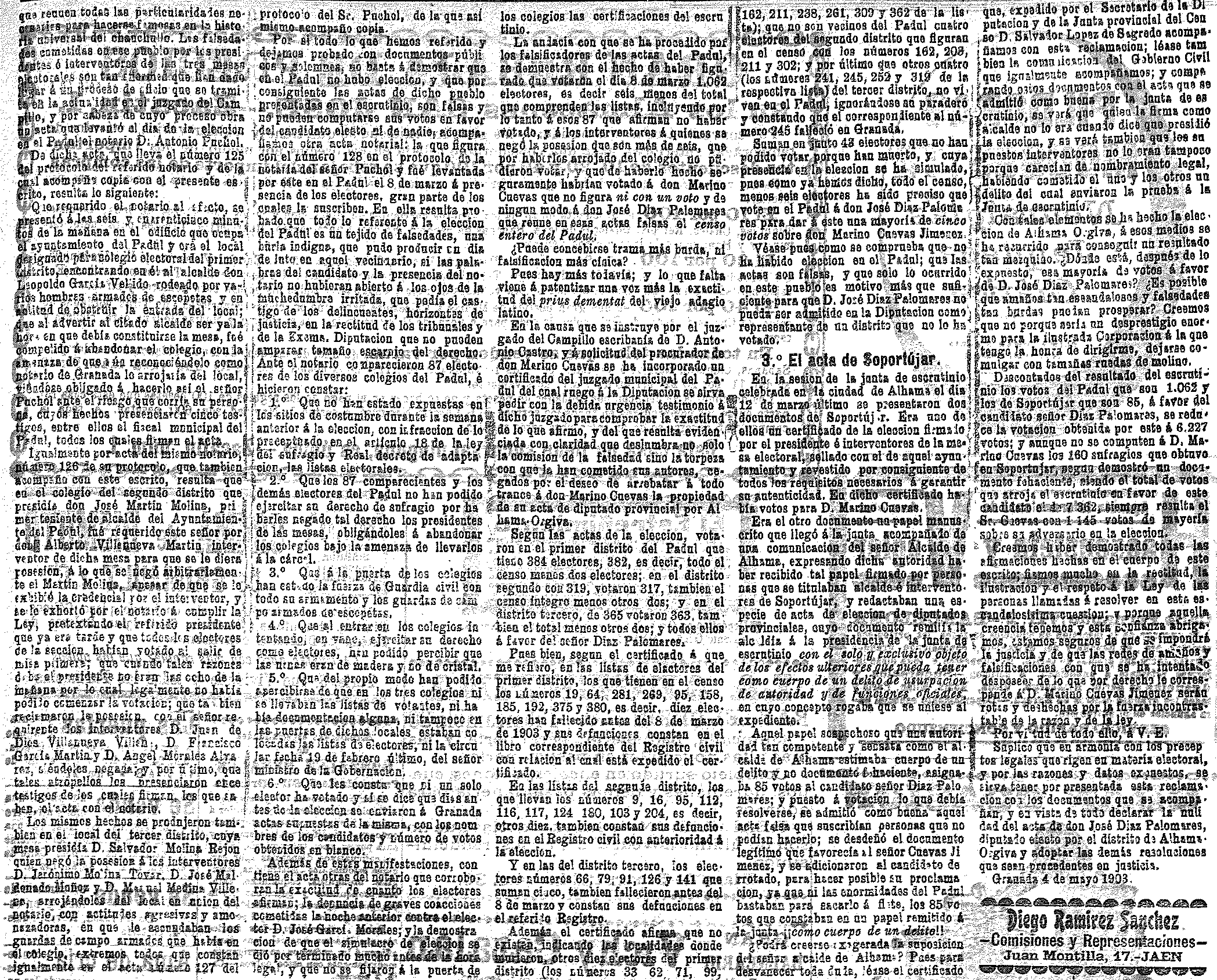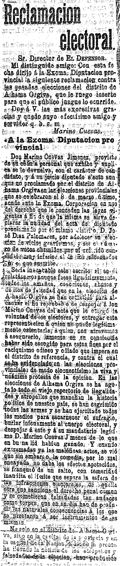 4 de mayo de 1903. El elector Mariano Cuevas reclama por las elecciones celebradas y pone de ejemplo como lugar con problemas a Padul