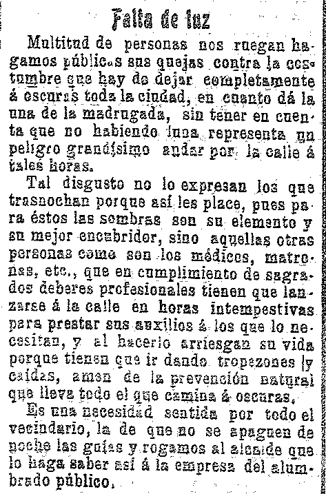 19 de septiembre de 1909. En Granada la luz se corta a las una de la madrugada quedando la ciudad totalmente a oscuras