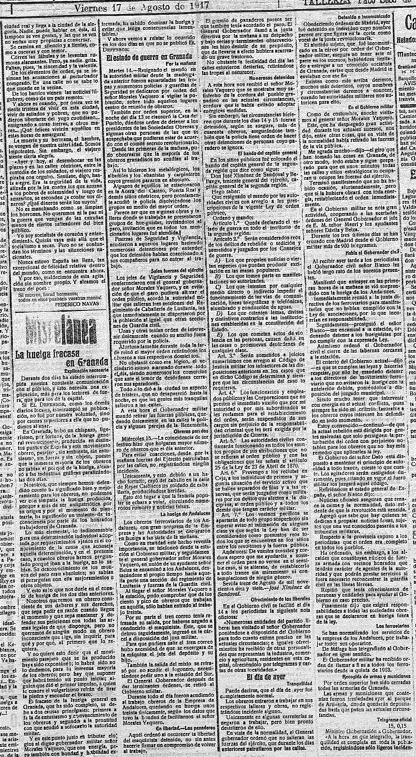 17 de agosto de 1917. Huelgas en toda España. También en Granada. Varios días sin periódico y declaración del estado de guerra