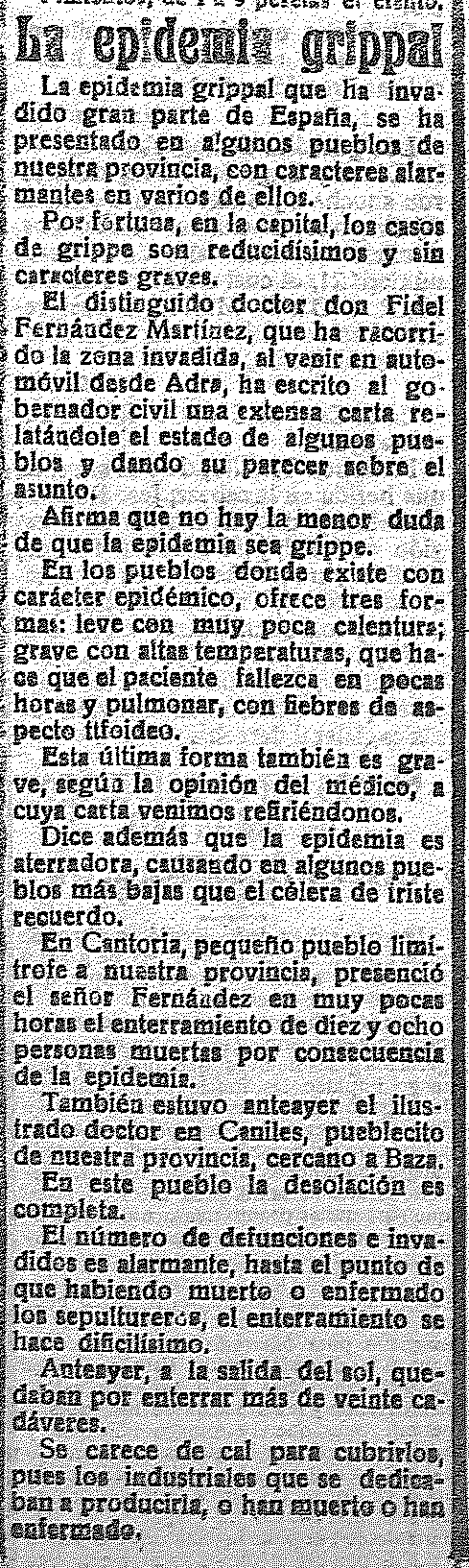 28 de septiembre de 1918. Epidemia de gripe se extiende por gran parte de España empieza a aparecer en nuestra provincia durará hasta el final del 18