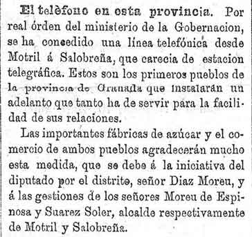 2 de noviembre de 1886. Primera línea telefónica concedida en Granada desde Motril a Salobreña