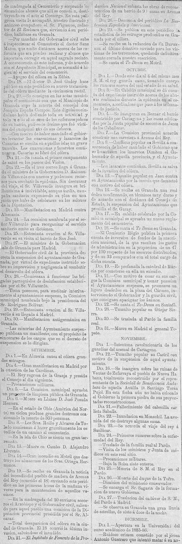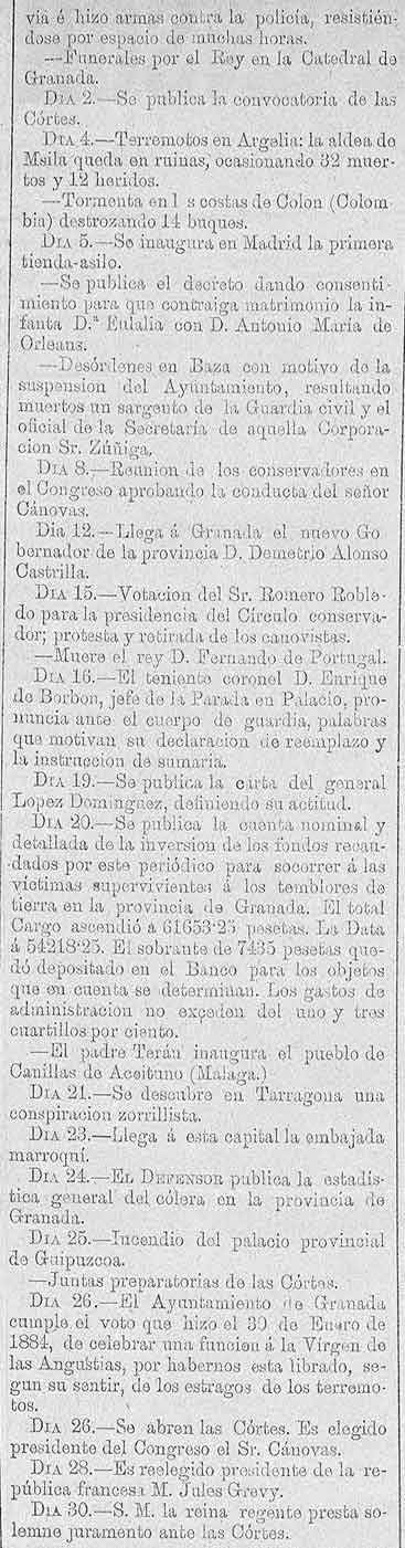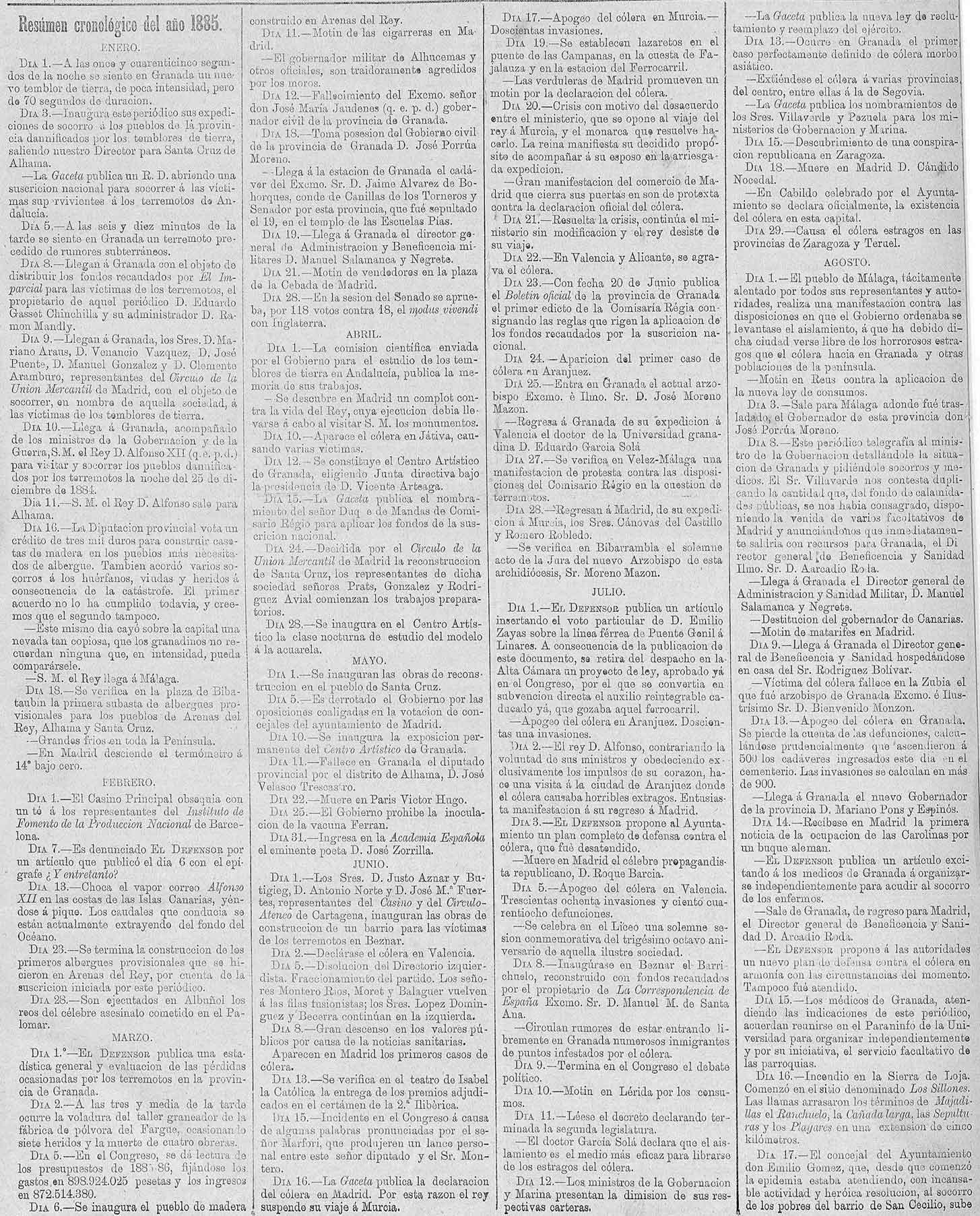 Datos sobre las ayudas y la reconstrucción del terremoto de 25 de diciembre del 84. Visita del Rey. El 10 de abril se detecta el cólera en Jativa, se va extendiendo por diversas provincias el 13 de julio se detecta el primer caso en Granada, con un fuerte apogeo en agosto. El 25 de noviembre muere el Rey Alfonso XII