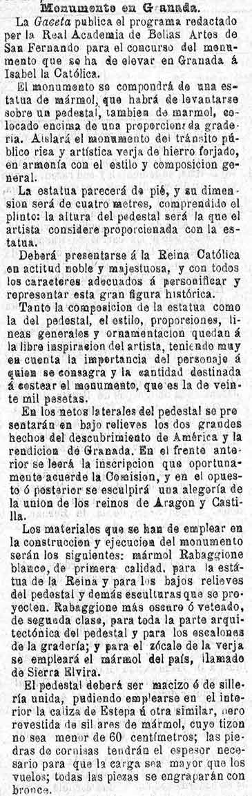 15 de abril de 1891. Proyecto de Monumento a Isabel La Católica en Granada