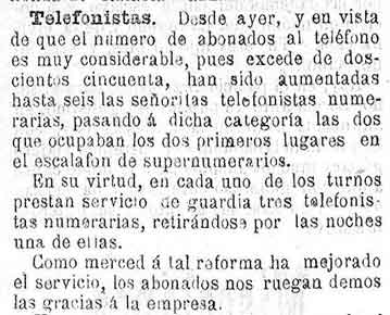 3 de julio de 1890. Se contratan más telefonistas. Los abonados son más de 250