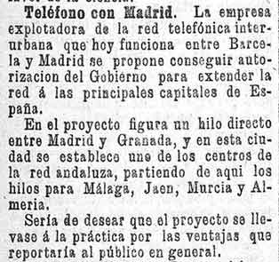 5 de octubre de 1895. Proyecto de hilo telefónico entre Granada y Madrid