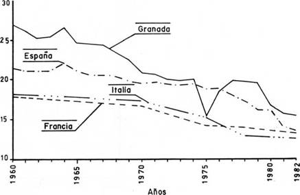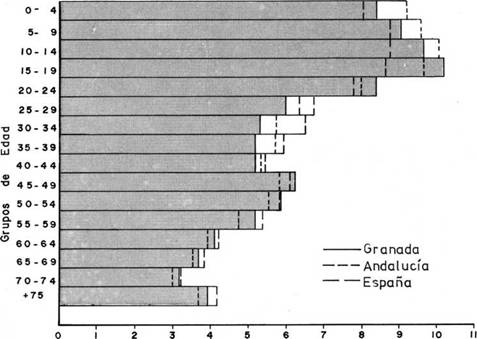 La distribución porcentual de la población (para la provincia de Granada, la comunidad andaluza y el total nacional) por grupos de edad, según el censo de 1981, está reflejada en el cuadro y figura adjuntos. Hay que resaltar que el estrato de 15 a 55 años representa en Granada el 52.4% del total, porcentaje similar al que se encuentra tanto a nivel nacional (53.1%) como a nivel andaluz (52.1%). Este valor se ha incrementado en relación al censo de 1975, cuya cifra era del 48.7%, si bien ha descendido comparativamente al censo de 1950, que ofrecía un valor del 56.9% .