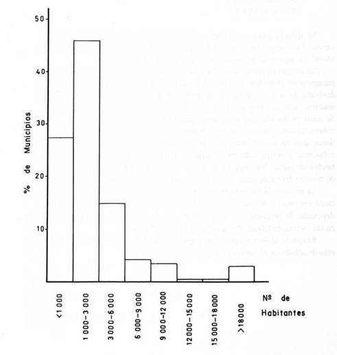 La distribución porcentual del número de municipios en relación a su población está reflejada en la figura adjunta, de la que se deduce que el mayor porcentaje está representado por aquellos cuya población está comprendida entre 1.000 y 3.000 habitantes, correspondiendo el menor porcentaje a los municipios cuya población excede de 12.000 habitantes y es menor de 18.000.