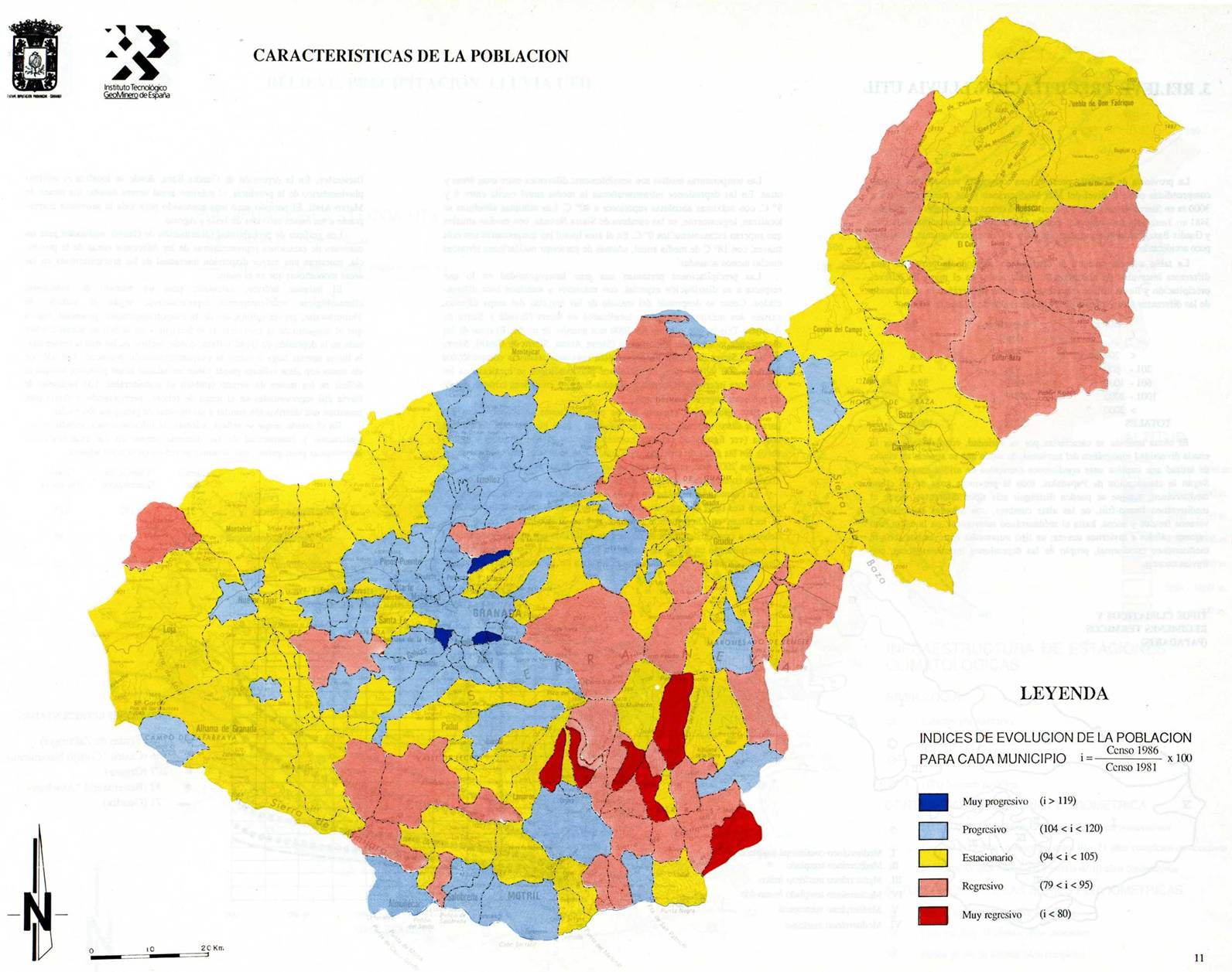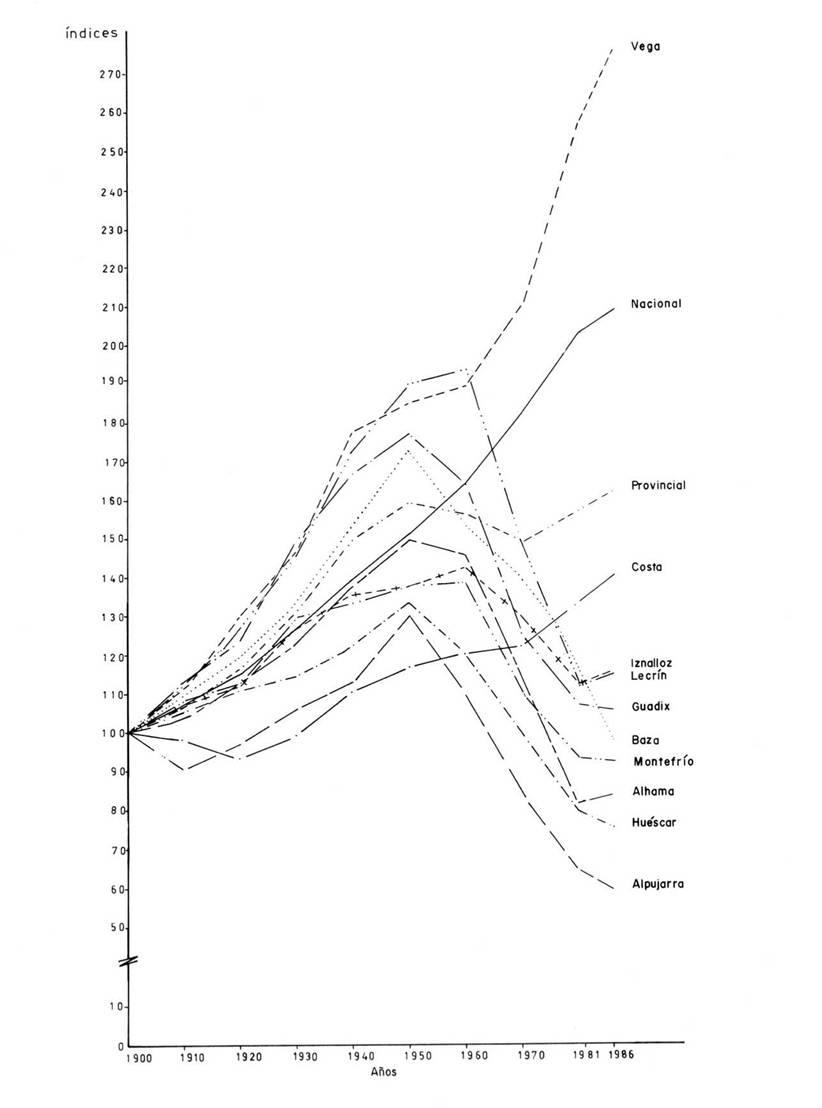 Tanto en la figura de evolución de la población respecto a 1900, como en el mapa de características de la población, destaca la existencia de dos comarcas con tendencias progresivas y fuertes incrementos demográficos, que coinciden con las ya citadas de La Costa y La Vega. Esta última, en particular, ha duplicado su población en lo que va de siglo.