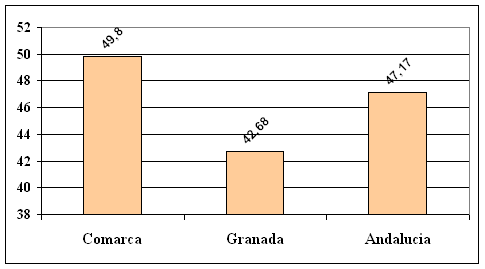 Sin embargo, esta cifra global enmascara, las diferencias por municipios, que oscila oscilando entre el 44,61 % de Dúrcal y el 58,55 % de Nigüelas.