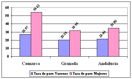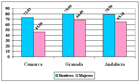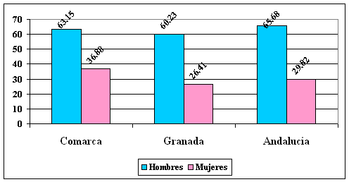 Hay que destacar en este indicador el considerable incremento en los últimos años debido, entre otras razones a la elevada incorporación de la mujer al mundo laboral, existiendo una tasa de actividad femenina referida en el conjunto comarcal del 36,88 %, mientras la masculina es del 63,15 %.
