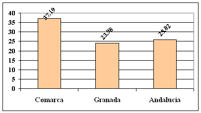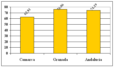 En 1991, fecha censal a la que aún debemos remitirnos para conocer este dato por comarcas, esta tasa se situaba en La Comarca del Valle de Lecrín, en un 49,80 %, superior a la de la Provincia y sensiblemente por encima del de la Comunidad Autónoma.