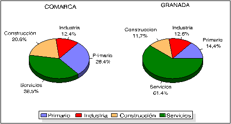 Atendiendo a la población ocupada por rama de actividad, en 1991 se apreciaba en la comarca un claro predominio del sector terciario que daba empleo al 38,50 % de la población, seguido del primario con un 28,40 %, y de la construcción (20,60 %) y la industria (12,40 %).