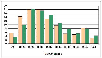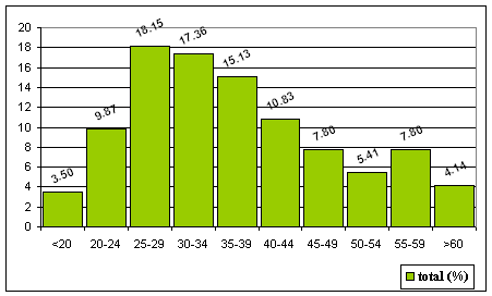 Por edad destaca la juventud de la población parada. El mayor número de inscritos en las listas del desempleo se sitúa entre los 25 y los 29 años, sector de edad que está flanqueado por otros dos intervalos con elevados promedios del fenómeno, atenuándose la situación a partir de los 45 años.